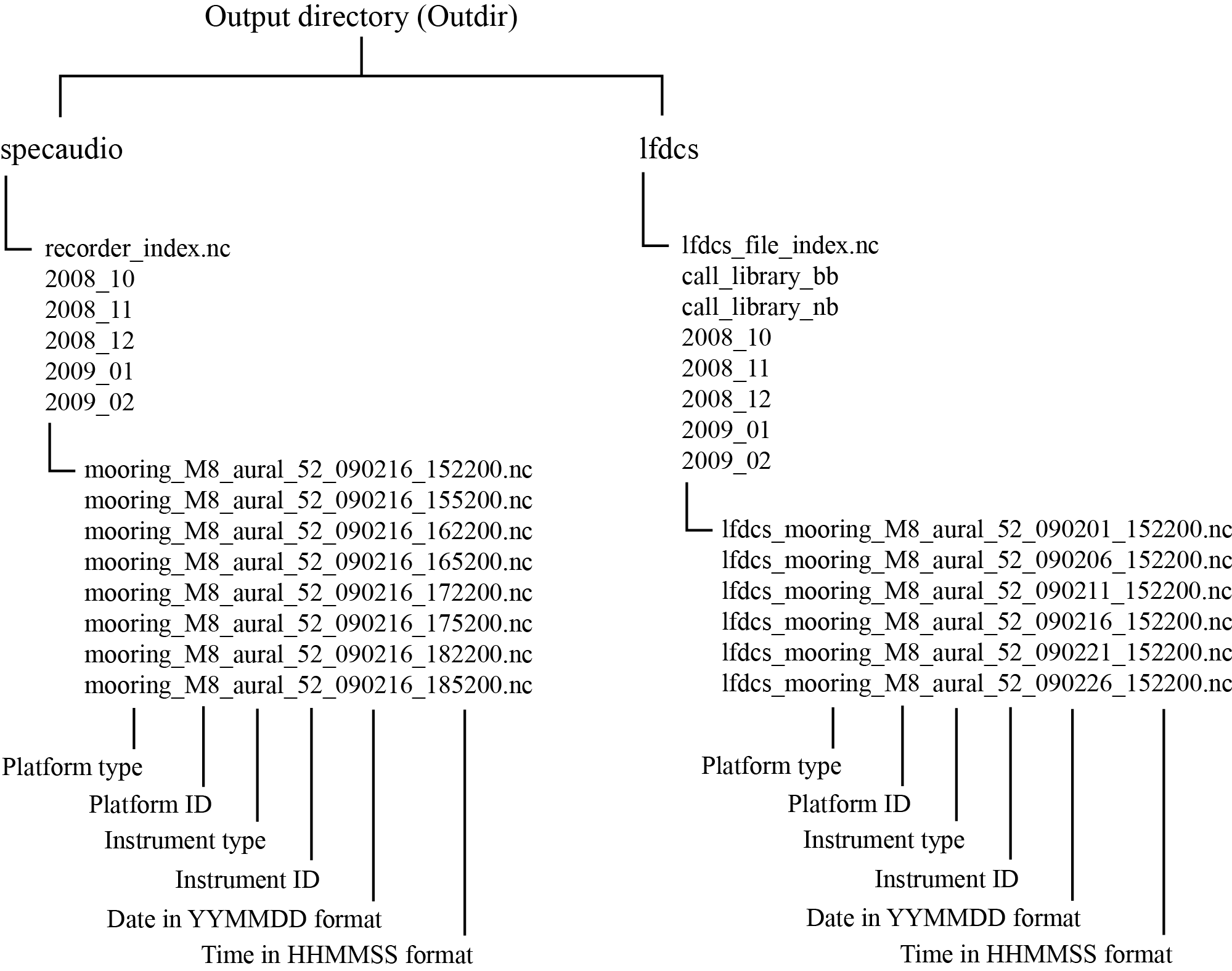 Reformatted recordings and spectrograms are stored in a subdirectory of the output directory (specified as "Outdir" in the parameter file) called "specaudio", while detection and classification information is stored in a subdirectory of the output directory called "lfdcs". The archived narrow- and broadband call libraries are stored in subdirectories "lfdcs/call_library_nb" and "lfdcs/call_library_bb", respectively. The directory structure is as follows: