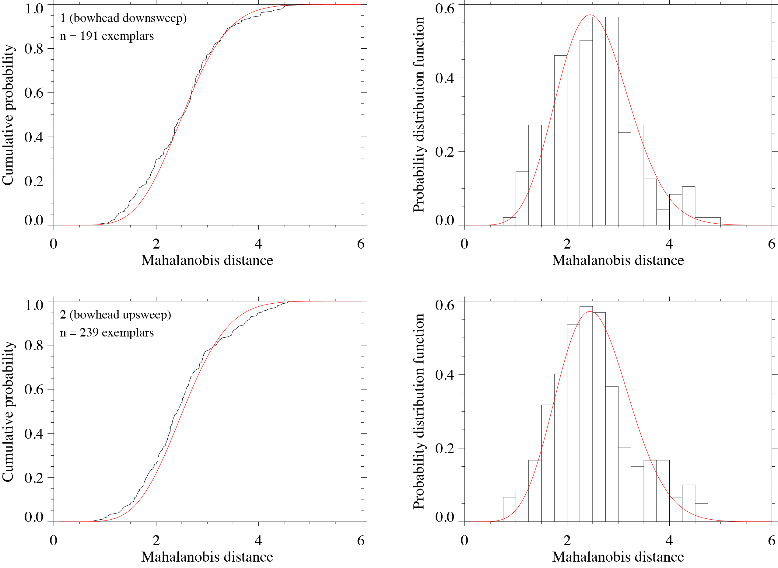 The low-frequency detection and classification system (LFDCS) is an automated processing system designed to identify baleen whale calls using pitch tracking and quadratic discriminant function analysis (see Baumgartner and Mussoline 2011). The LFDCS algorithm uses dynamic programming to estimate a pitch track for any type of narrowband call. A pitch track is a compact representation of a sound (analogous to a series of notes on a page of sheet music) derived from an audio spectrogram; it consists of a time series of frequency-amplitude pairs that describe the frequency and amplitude modulation of a sound. Attributes of the pitch track (e.g., start frequency, end frequency, duration, slope of frequency variation) are extracted and compared to the attributes of known call types using quadratic discriminant function analysis. The call library can contain hundreds of these known call types, allowing the LFDCS to efficiently detect and classify many different calls produced by numerous species.