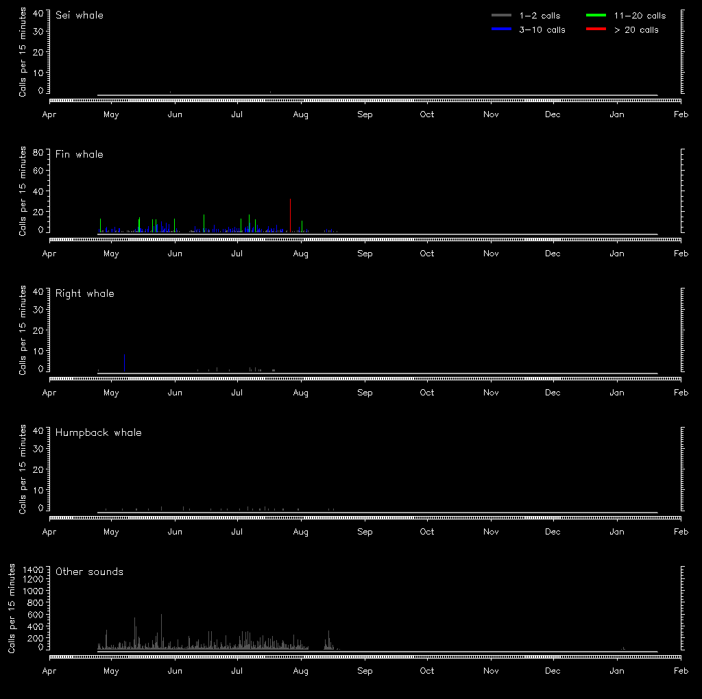 | Date/time | Sei whale | Fin whale | Right whale | Humpback whale | Other | Duration | Tracks | Reviewed |