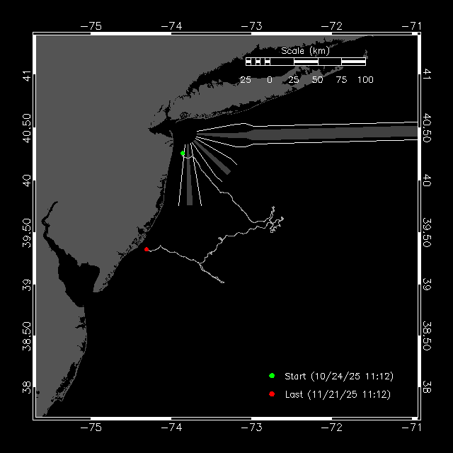 A Slocum G3 glider was deployed off the coast of Atlantic City, New Jersey to conduct surveys for tagged fish and baleen whales, including the critically endangered North Atlantic right whale.