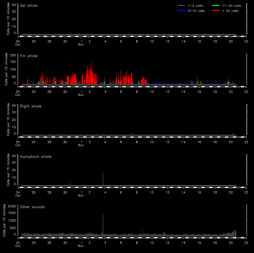 | Date/time | Sei whale | Fin whale | Right whale | Humpback whale | Other | Duration | Tracks | Reviewed | Map | Latitude | Longitude |