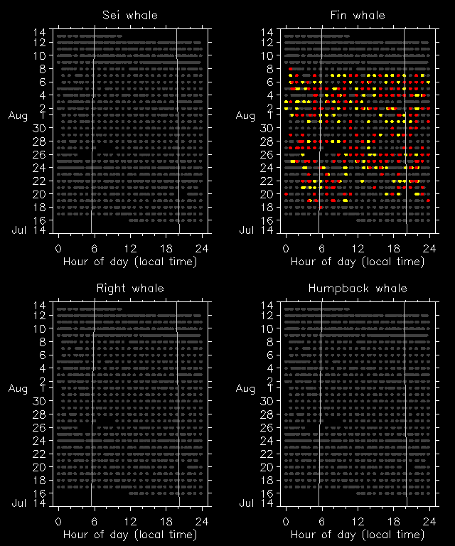 What types of sounds are we monitoring? Find examples of the sounds right, fin, sei and humpback whales make here.